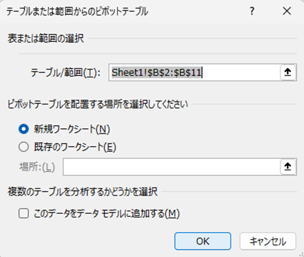 ピボットテーブルの作成ダイアログが表示されたら、配置場所を選択して「OK」をクリックしましょう。