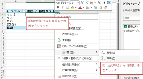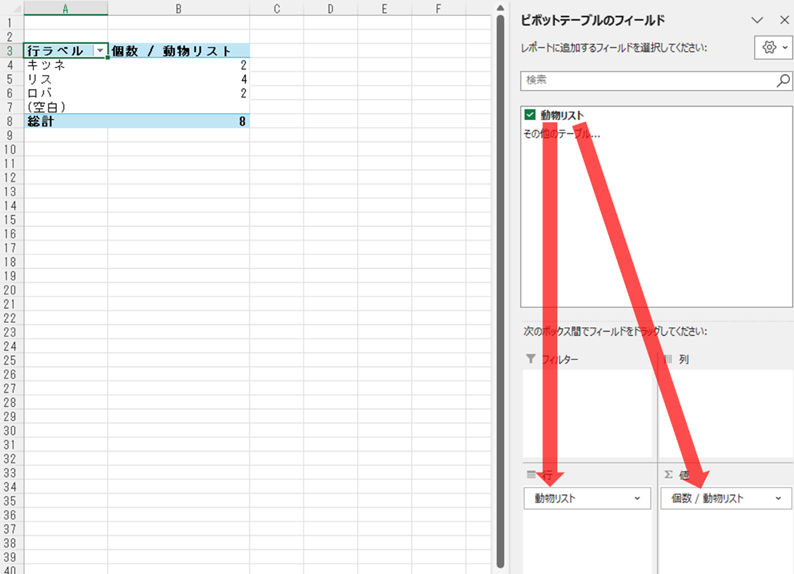 同じ項目を「値」エリアにもドラッグすると、各種類の出現回数が表示されます。
