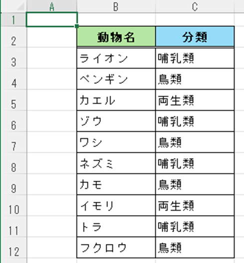 B列に「動物名」、C列に「分類」が入っているサンプルデータがあります。