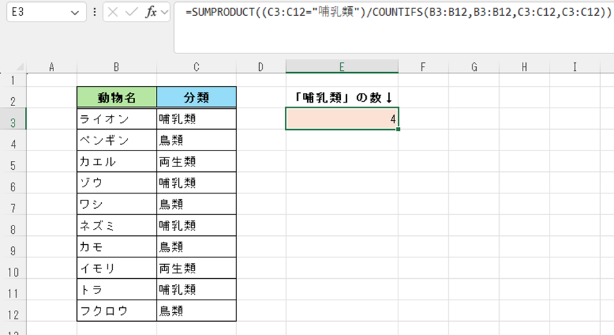 =SUMPRODUCT((C3:C12=”哺乳類”)/COUNTIFS(B3:B12,B3:B12,C3:C12,C3:C12))