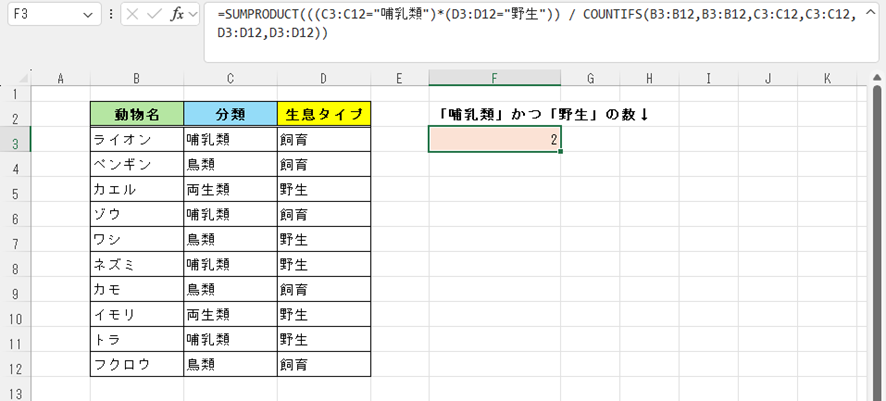 =SUMPRODUCT(((C3:C12=”哺乳類”)*(D3:D12=”野生”)) / COUNTIFS(B3:B12,B3:B12,C3:C12,C3:C12,D3:D12,D3:D12))